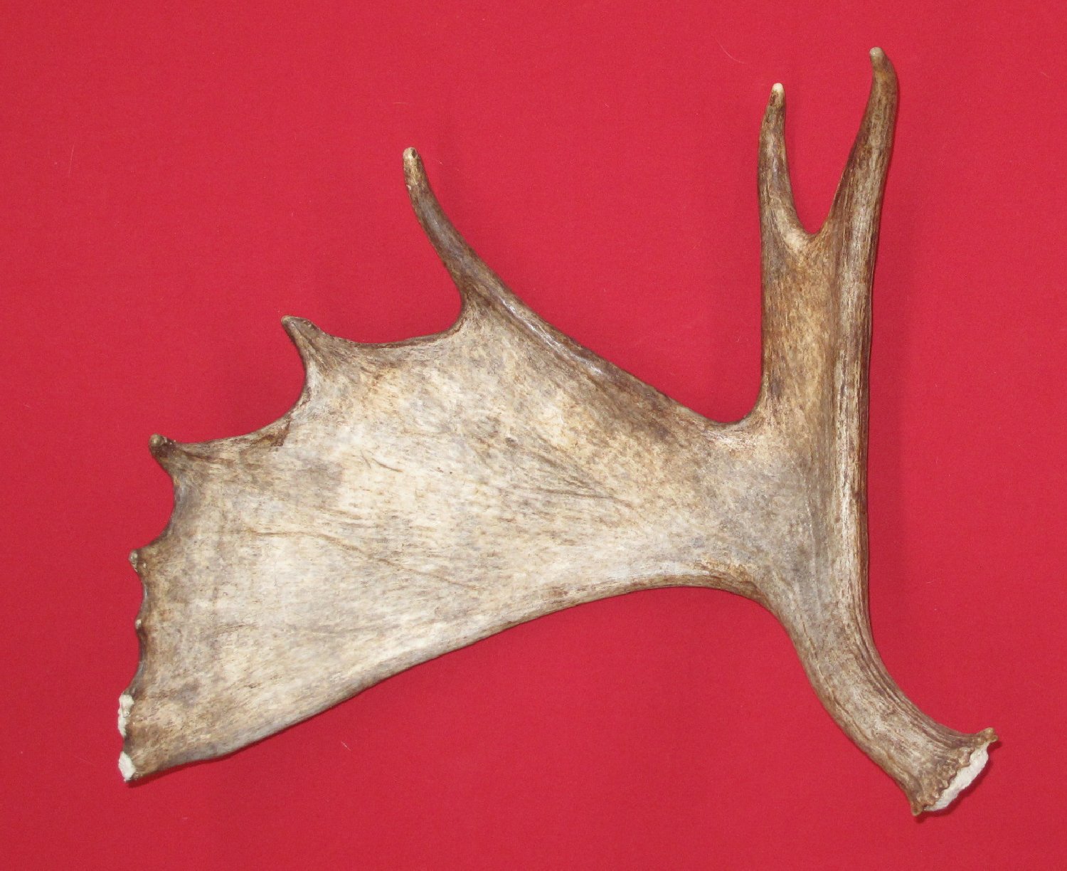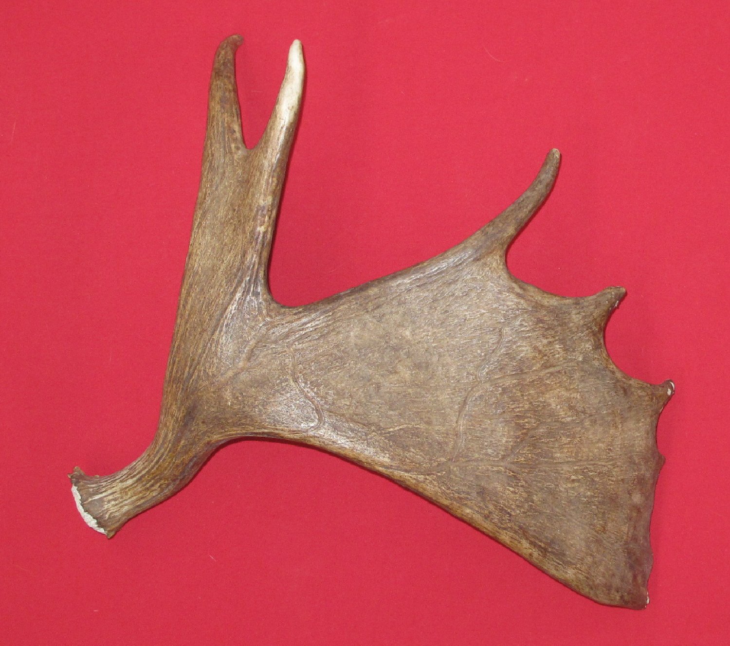 Lot # 2560-1253Complete sideleft side; shed 9 points 5.02 lbs. hard brown color #1 except two outermost tine at distal end of palm chewed off; tooth "touches" on 5 additional tines out distal end of palm. Beautiful side; nice stem $99.95 /eaK-4 |