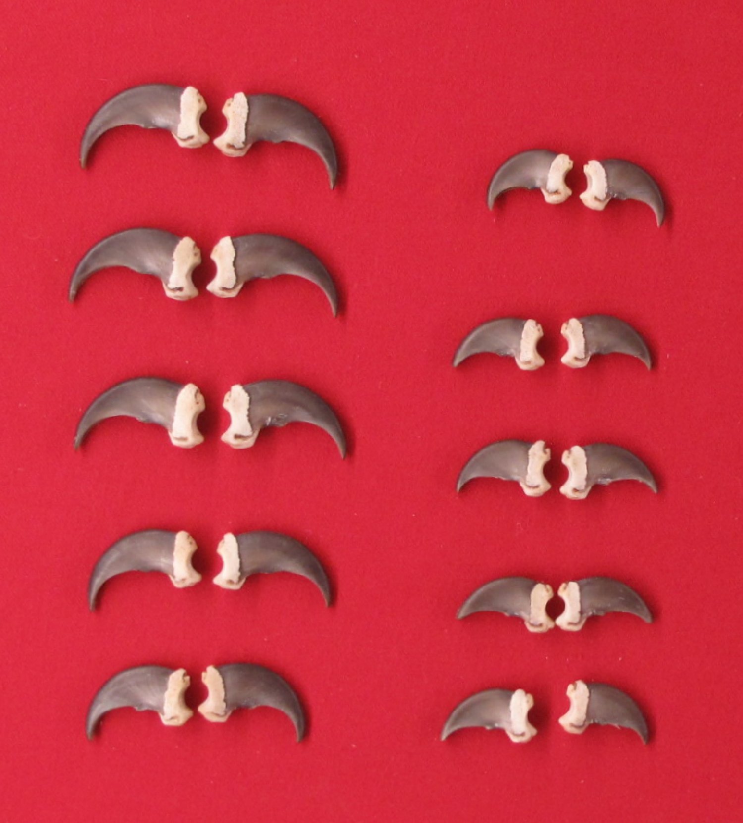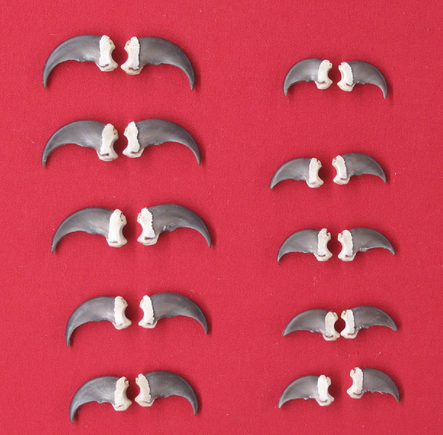 Lot # 2736-0735LMlargest claws 2-2.25" long black color from same animal, hair removed, dried 1 set = 20 claws #1 quality $175.00 /setF-30 Quantity Available: