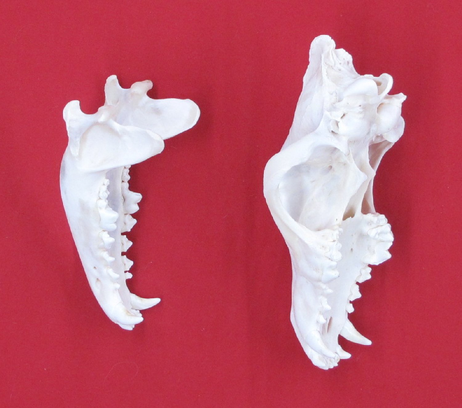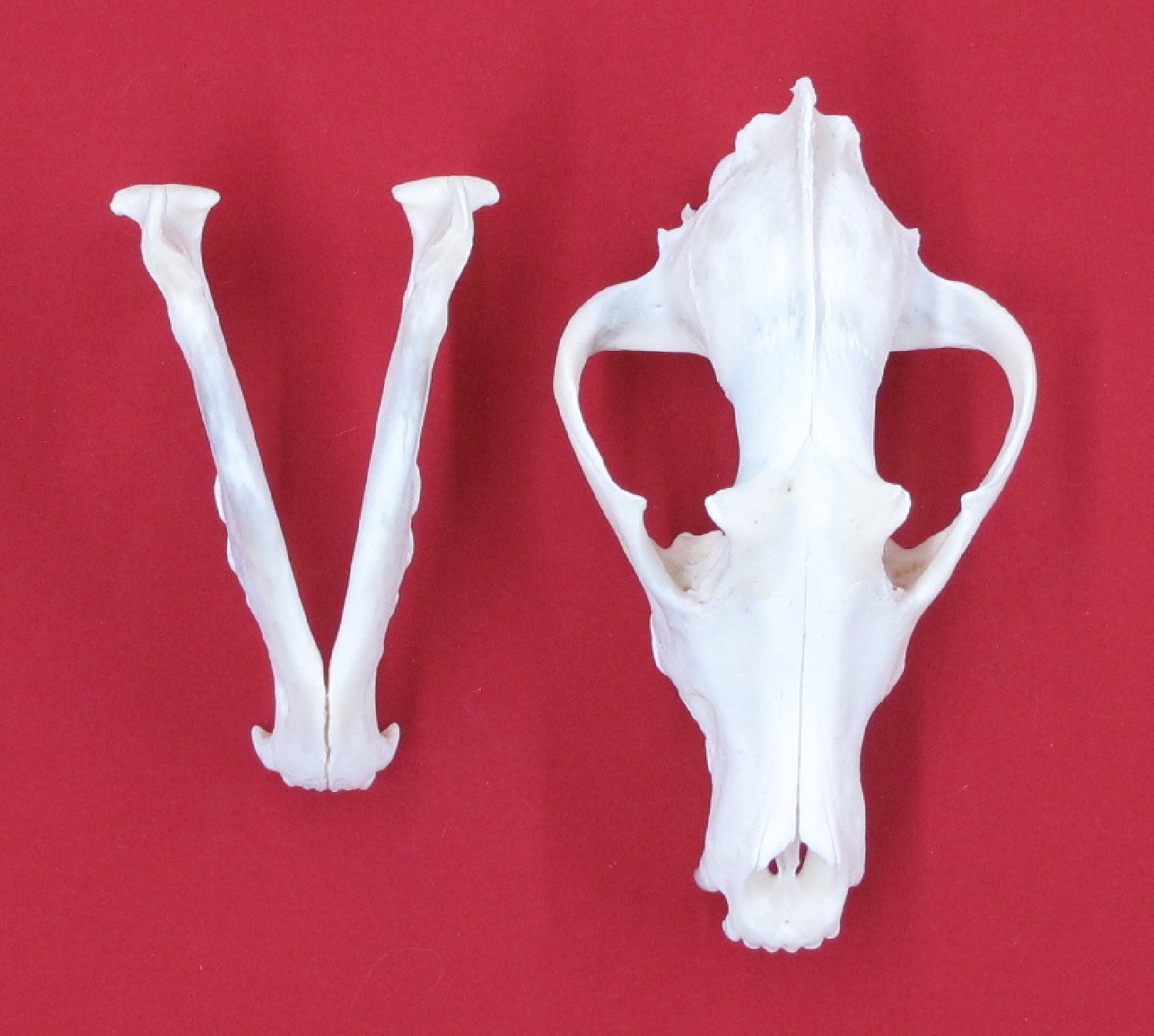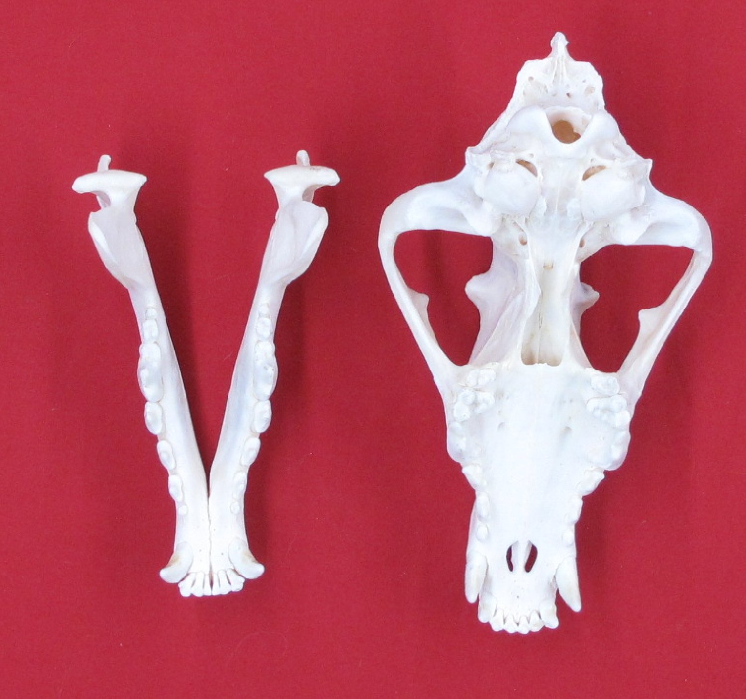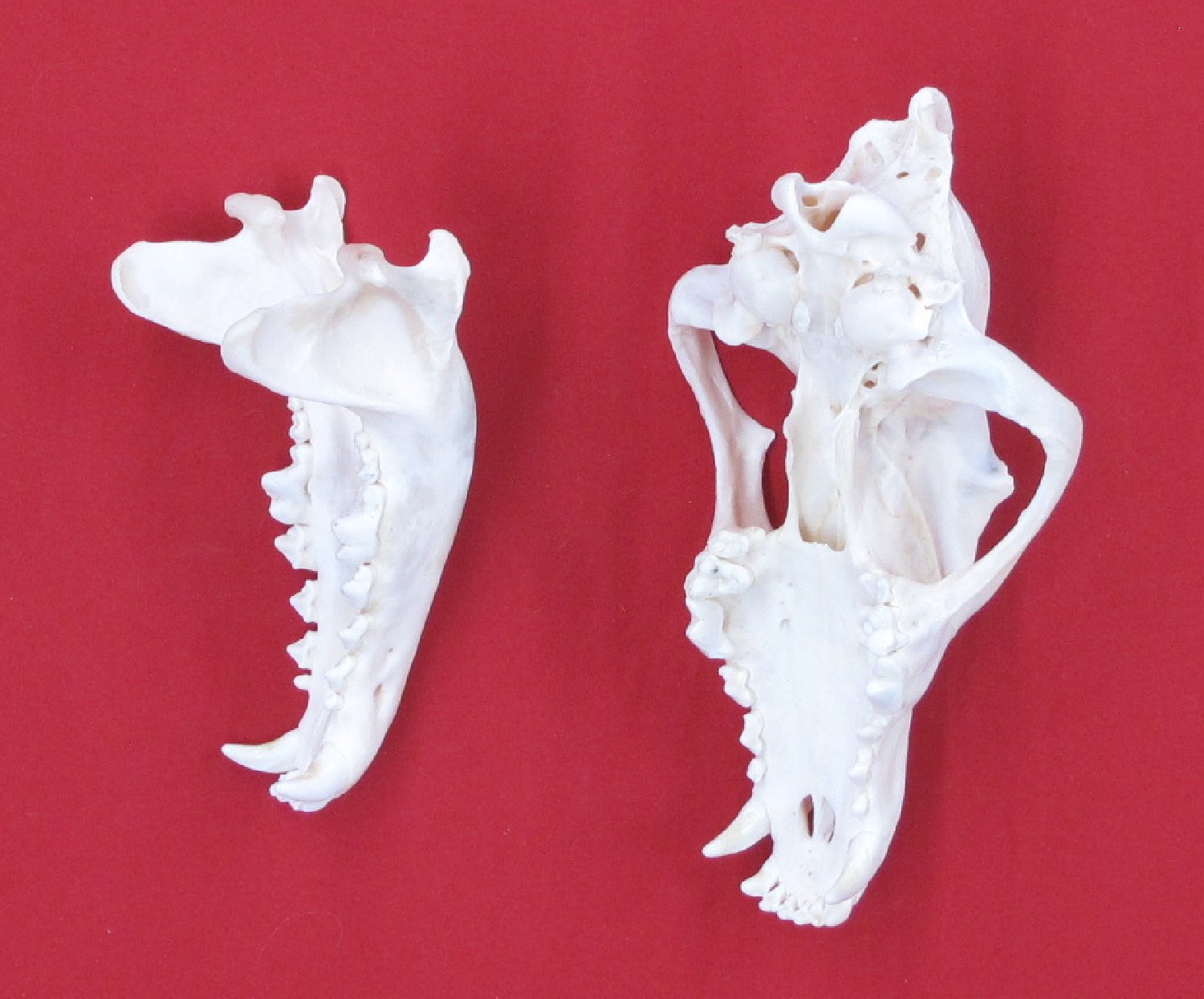 Lot # 5291-9853AlaskaXXXXL 11.25" long professionally BEETLE CLEANED #1 except some small amount of tooth damage on upper canines and tips of carnassials, molars. Huge mature male. Has very prominent sagittal crest. Has some calciferous deposits from onset of arthritis. Nice skull $399.95 /eaF-7 |